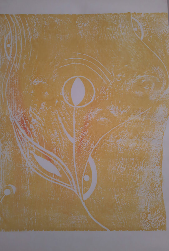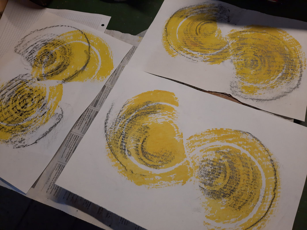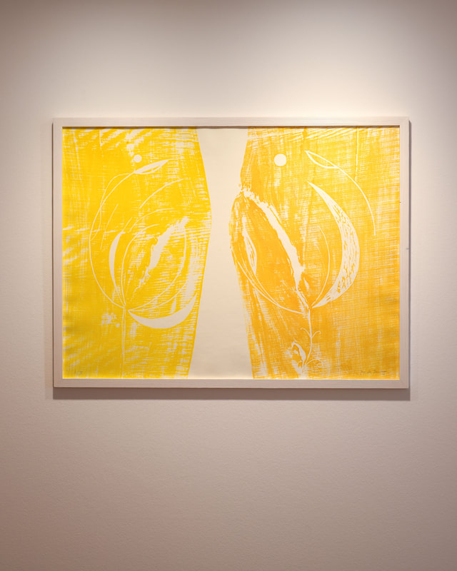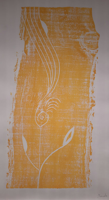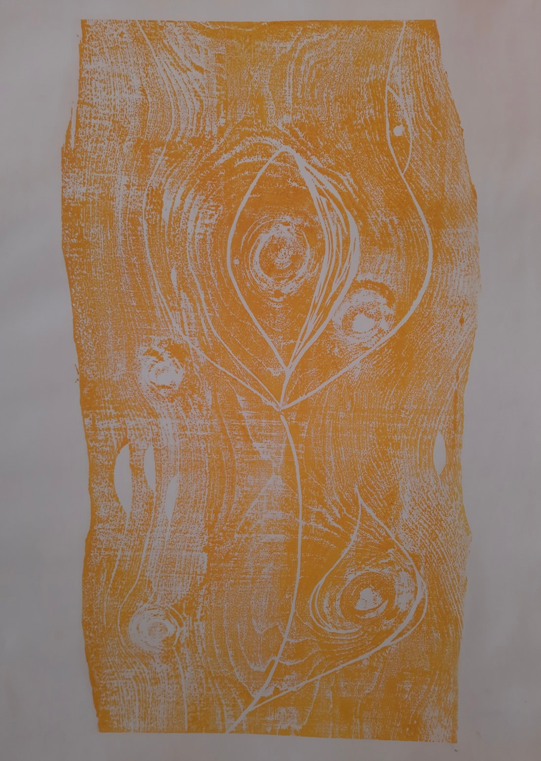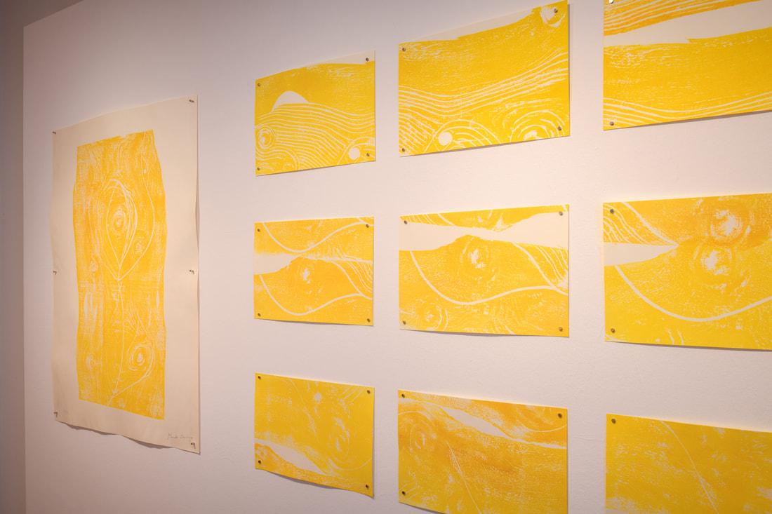 « Dans ses Fissures fleuries, l’artiste lausannoise Maude Sauvage met en lumière, à travers la technique de l’estampe japonaise, la complexité des blessures humaines. Les irrégularités que l’on retrouve dans le bois sont transformées, sublimées par la plasticienne dans cette série d’estampes réalisées en jaune, sa couleur de prédilection. » Chloé Cordonier