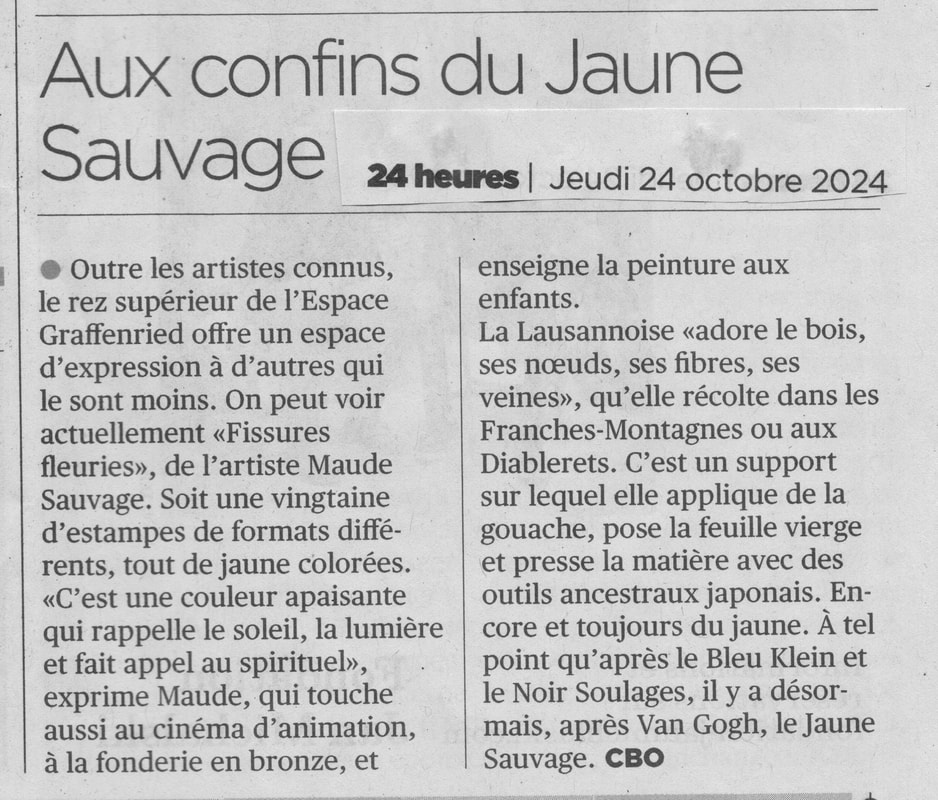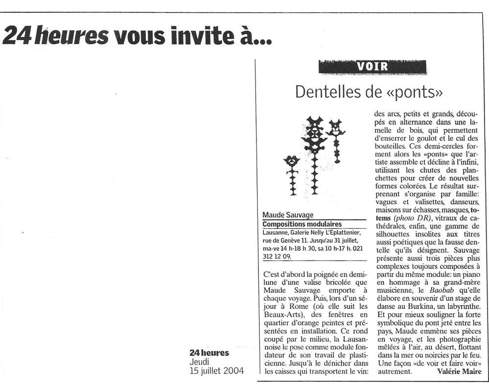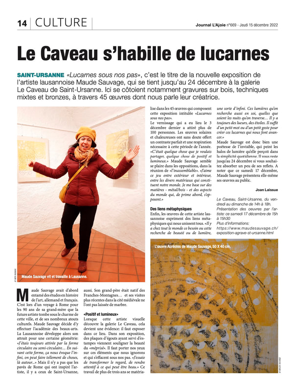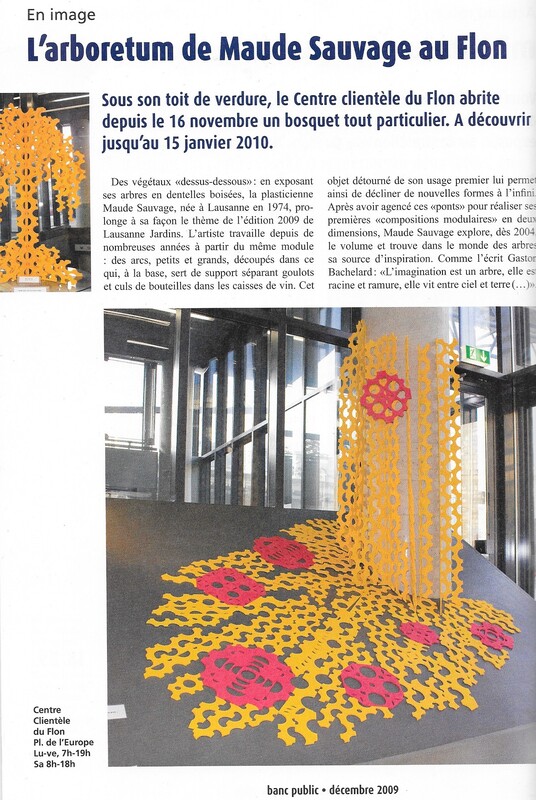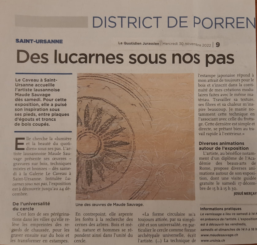 Maude, nous la connaissons un peu et nous découvrons Giselle qui nous vient de Paris. (…) Le choix des matériaux est toujours intéressant pour comprendre un artiste et ce que nous présente Maude aujourd’hui nous crie son amour pour le bois. Donc le matériau de prédilection, finement découpé et assemblé. Et puis le cercle, diamètre et rayon, arc et corde, symbole primordial, et puis Euclide, le dédoublement du circulaire et les infinies combinaisons possibles de découpage laissant passer le jour, s’organisant dans un cache plus grand où l’on retrouve les motifs sylvestres. Le travail de Maude s’attache à ce vide-plein qu’elle structure, cette dentelle et ces vacuités géométriques révélant la lumière qui devient musicale. Le vide et le plein, prédilection du peintre oriental. Dans le cadre de ses travaux, l’artiste s’est intéressée à la technique japonaise de gravure sur bois et nous présente un échantillon de ses empreintes où l’on retrouve sa graphie particulière.